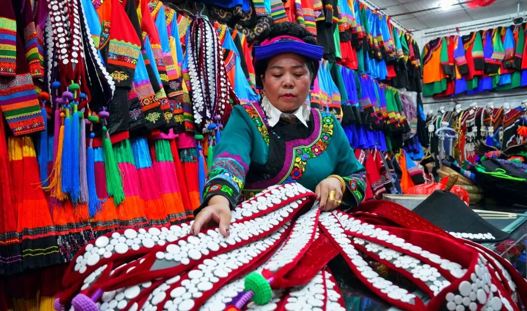 其工艺手法与彝族刺绣类似,做花极为讲究,布局技巧、装饰位置的选择一般是按耐用和美观两个标准来决定。