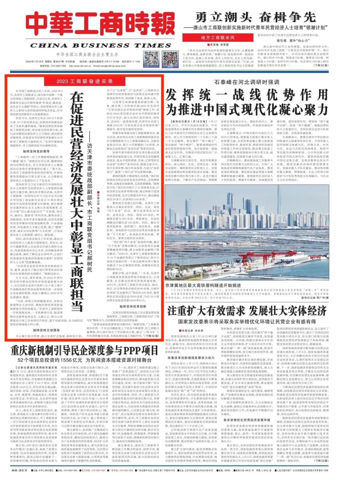 朝乾夕惕,功不唐捐。“一年来,天津市工商联坚持桥梁纽带助手职能定位,主动服务,扎实推动民营经济高质量发展。”2023年,天津市工商联共举办政企、银企、校企、法企等各类对接活动80余场,开展市区两级“企业服务日”等活动200余次,服务商协会及民营企业2500余家,为近10万家民营企业发放贷款5000多亿元。